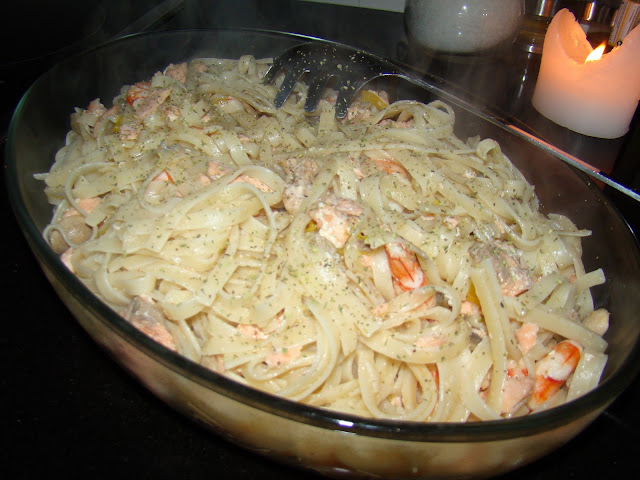 Colocar a cozer o salmão em água e sal bem como a massa em tachos à parte. Numa wok coloca-se um fio de azeite e margarina, deixa-se derreter e colocam-se os camarões lavados e descascados a cozinhar. Tempera-se com alho em pó. Depois de ficarem laranjas adiciona-se o pimento laminado e os cogumelos frescos laminados. Deixa-se cozinhar. Entretanto desfia-se o salmão e junta-se na wok bem como a massa cozida e escorrida. Envolve-se tudo muito bem, rega-se com sumo de limão, tempera-se de sal e serve-se polvilhado com oregãos.