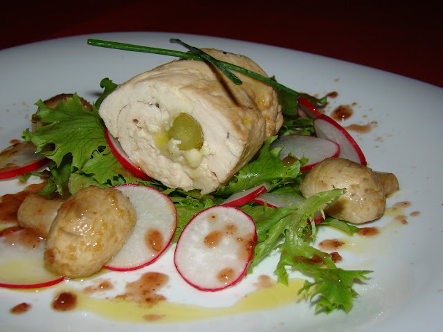 No prato servi alface, por cima rabanetes e dispus metade do bife recheado e cogumelos. Servi com condimento de Vinagre Creative, Azeite e Cebolinho.