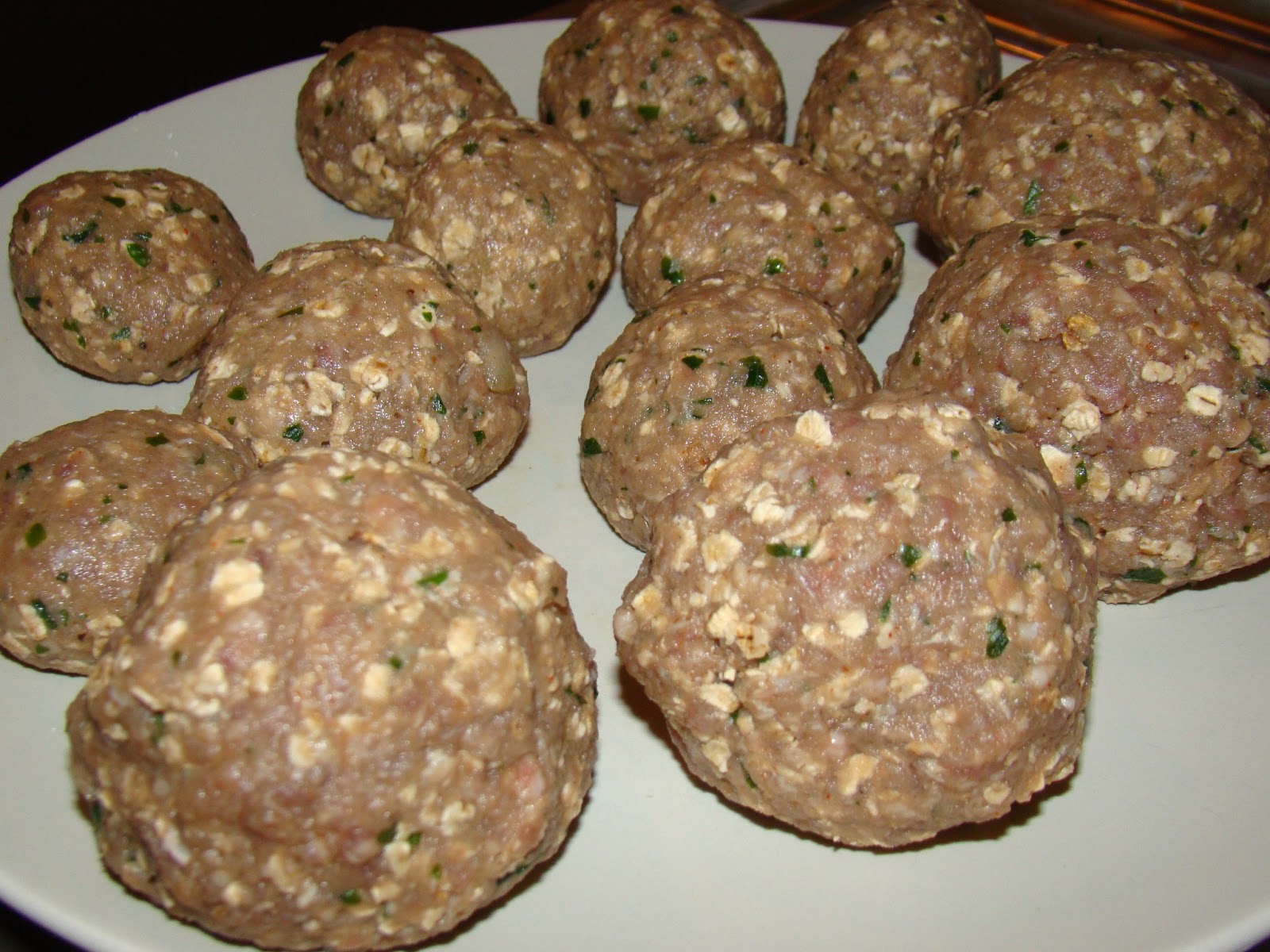 This was the second time I made meatballs. The first time I stuffed with cheese and this time I decided to use some quail eggs I had bought. Oats served to drie the paste. Garlic and onion were crushed in a blender until juice, all for Sr.Bruno so he did not find pieces.
