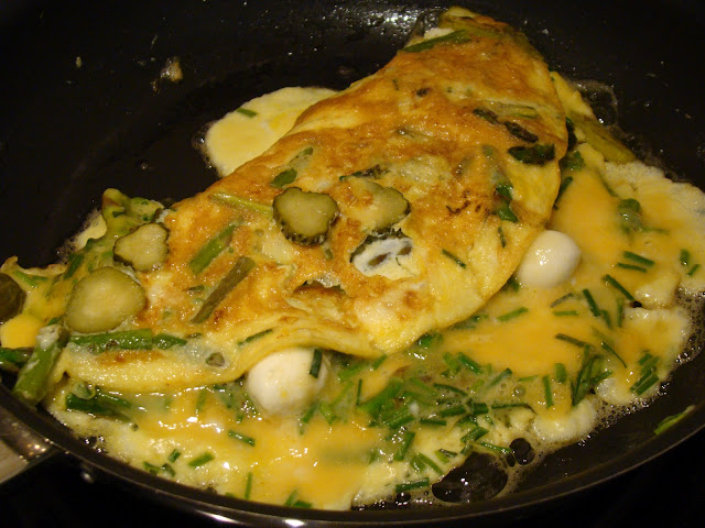Sauté the asparagus and the cornichons in olive oil. Beat the eggs with salt and the chives and add it to the vegetables. When folding the omelet put the cheese in the middle to melt.