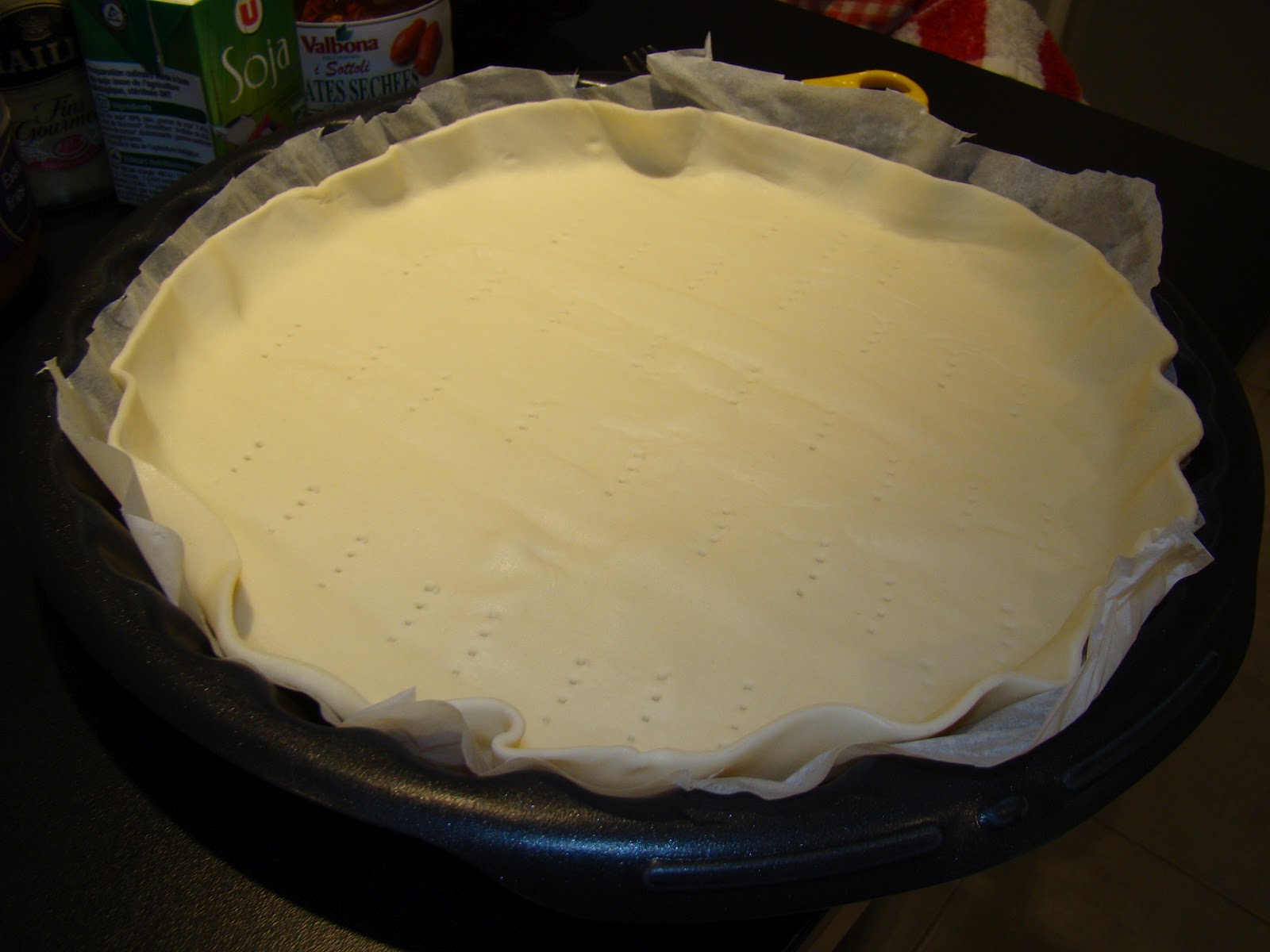 Estender a massa numa tarteira e picar o fundo. Colocar todos os legumes espalhados uniformemente. Numa taça bater os ovos e juntar o creme de soja e os temperos. Verter sobre os legumes e por cim colocar queijo cortado em pedaços.